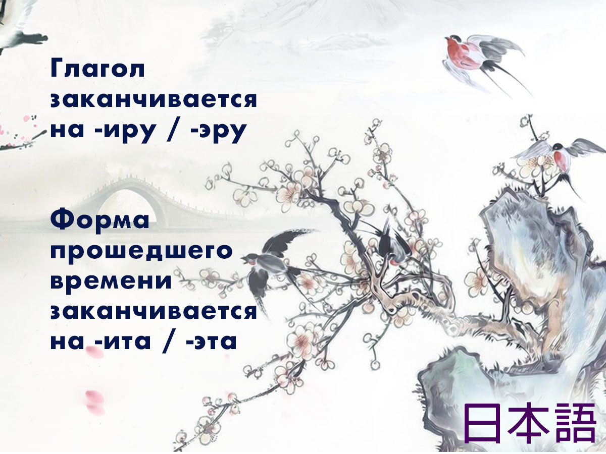 Исключения образуются с помощью -ТТА: 走る - хасиру - бежать 帰る – каэру – возвращаться 入る – хаиру – входить 知る – сиру – знать